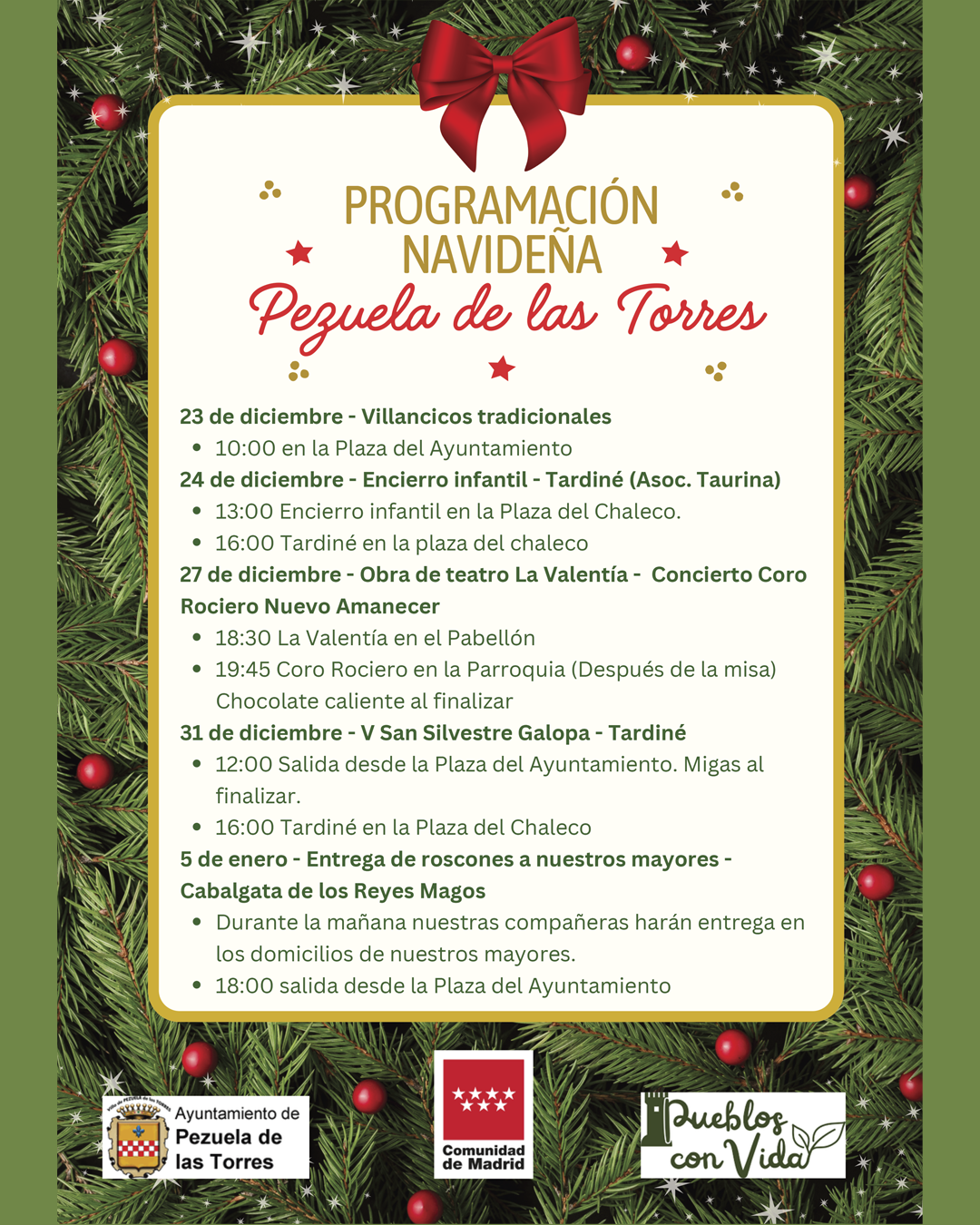 Desde todo el equipo del Ayuntamiento de Pezuela de las Torres queremos trasladar a todos los vecinos nuestros mejores deseos para estas fiestas, con una Navidad llena de paz, amor y buenos momentos compartidos.