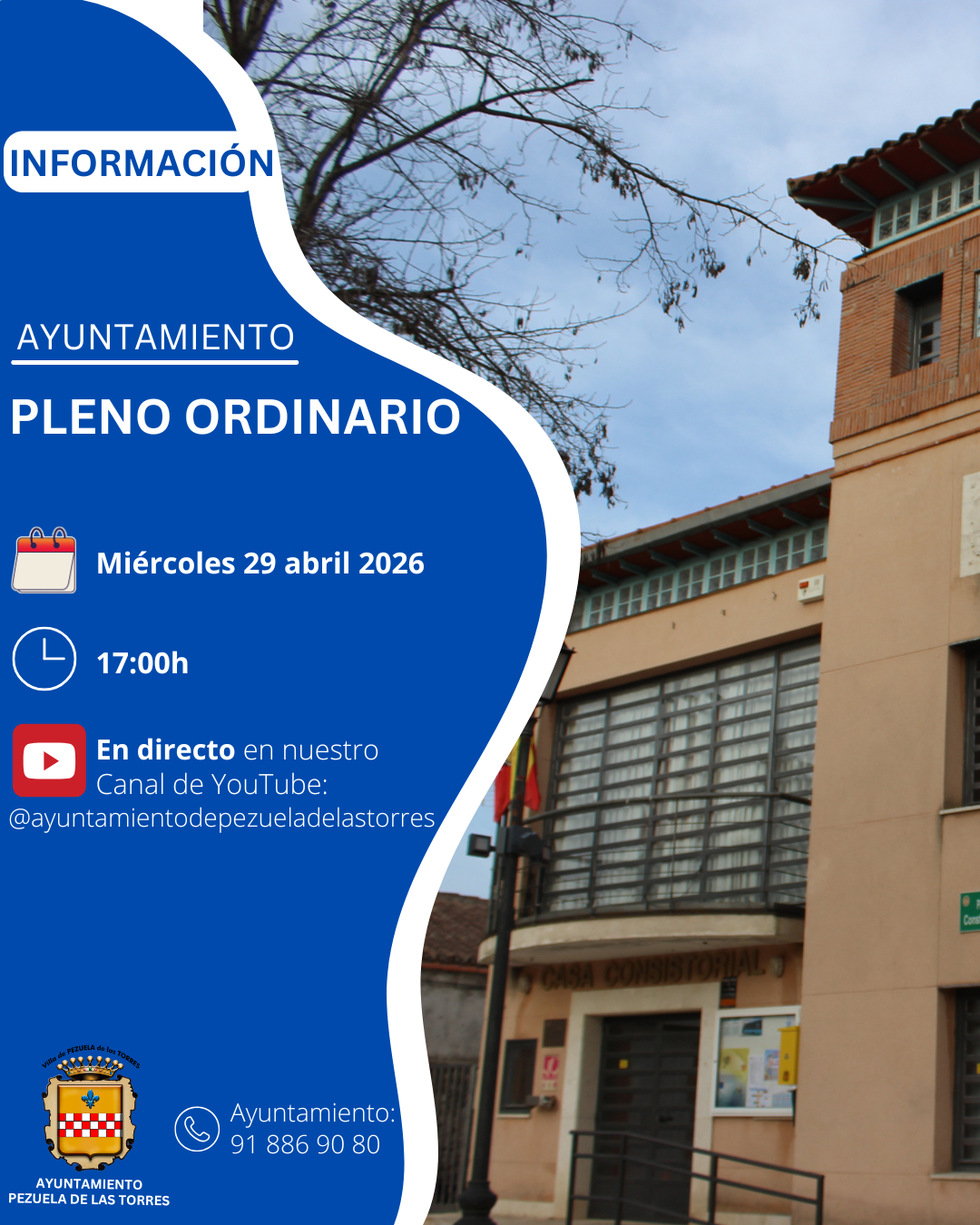 E l Ayuntamiento de Pezuela de las Torres celebrará Pleno Ordinario el jueves 15 de enero de 2026, a las 17:00 horas, en el Salón de Plenos del Ayuntamiento.